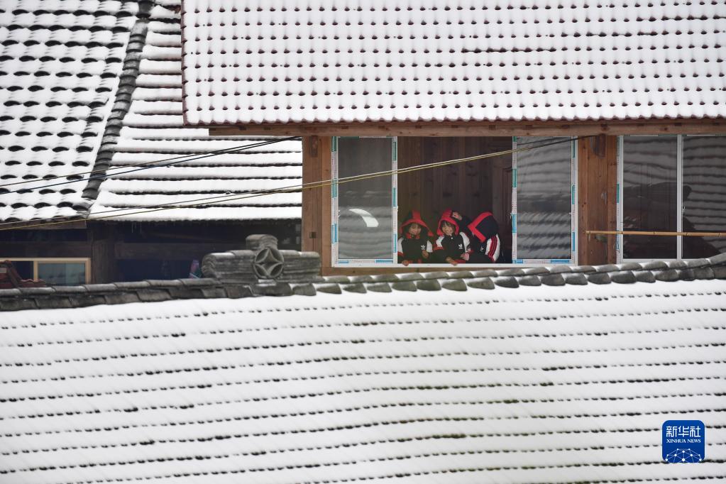 在乌英苗寨,几名小学生在家里看雪景(2021年12月27日摄)。