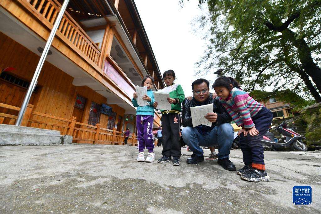 在乌英苗寨,驻村工作队队员覃天阳给孩子们辅导功课(2021年10月18日摄)。