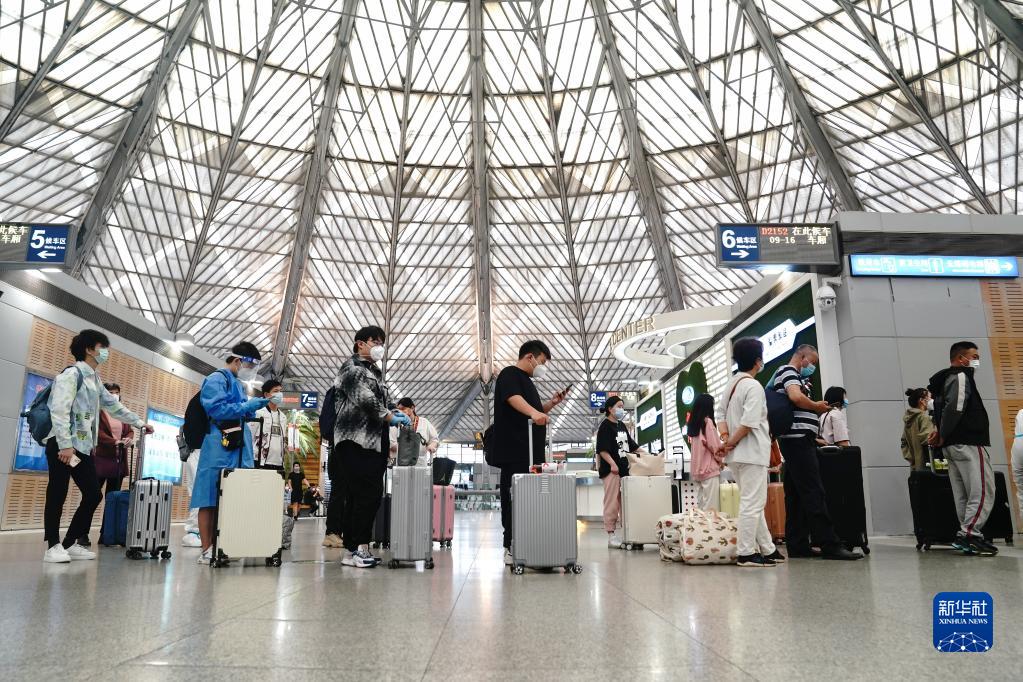 6月1日,旅客在上海南站排队等候上车。 新华社记者 丁汀 摄