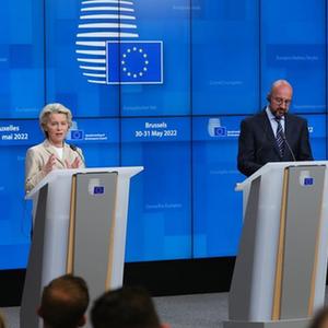 5月31日,在比利时布鲁塞尔,欧盟委员会主席冯德莱恩(左)和欧洲理事会主席米歇尔在欧盟特别峰会后举行新闻发布会。