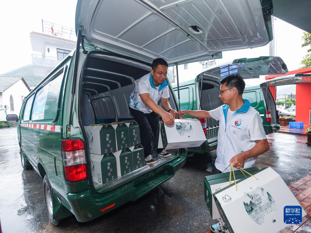 6月1日,在湖源乡村播馆门口,党员志愿者将装有灰汤粽等特色农产品的“湖源山礼”礼盒装车,销往外地。