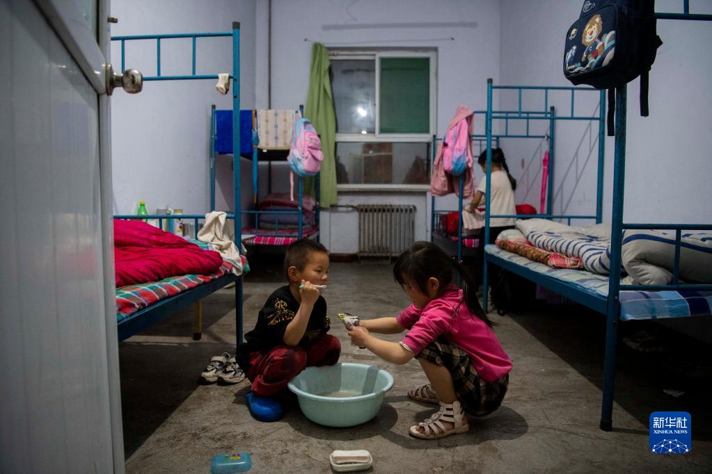 在鹅屋中心学校鹅屋寄宿制小学学生公寓,景鹏佳(右)为弟弟洗袜子,景义可(左)在一旁刷牙(5月25日摄)。