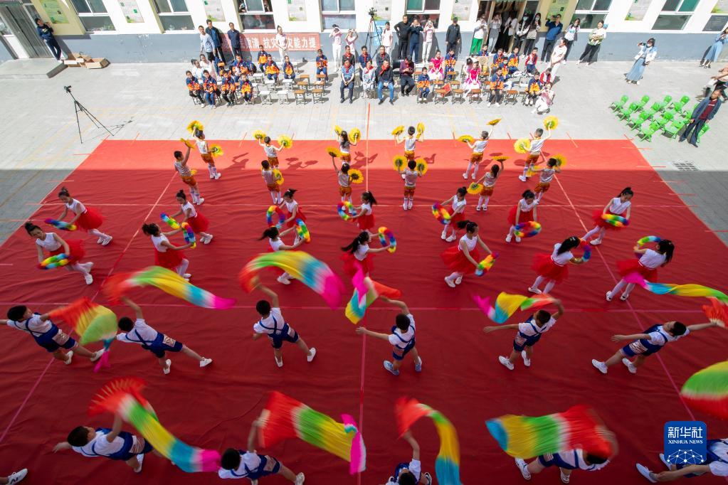 在鹅屋中心学校鹅屋寄宿制小学,小朋友们在表演节目(5月28日摄)。