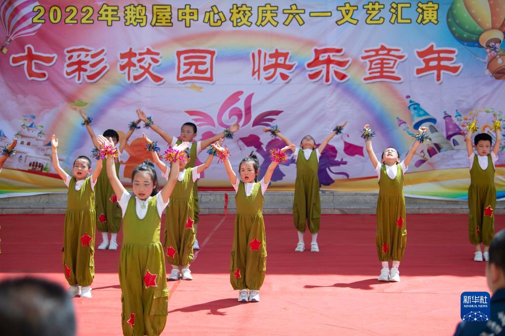 在鹅屋中心学校鹅屋寄宿制小学,景鹏佳(右四)和同伴在表演节目(5月28日摄)。