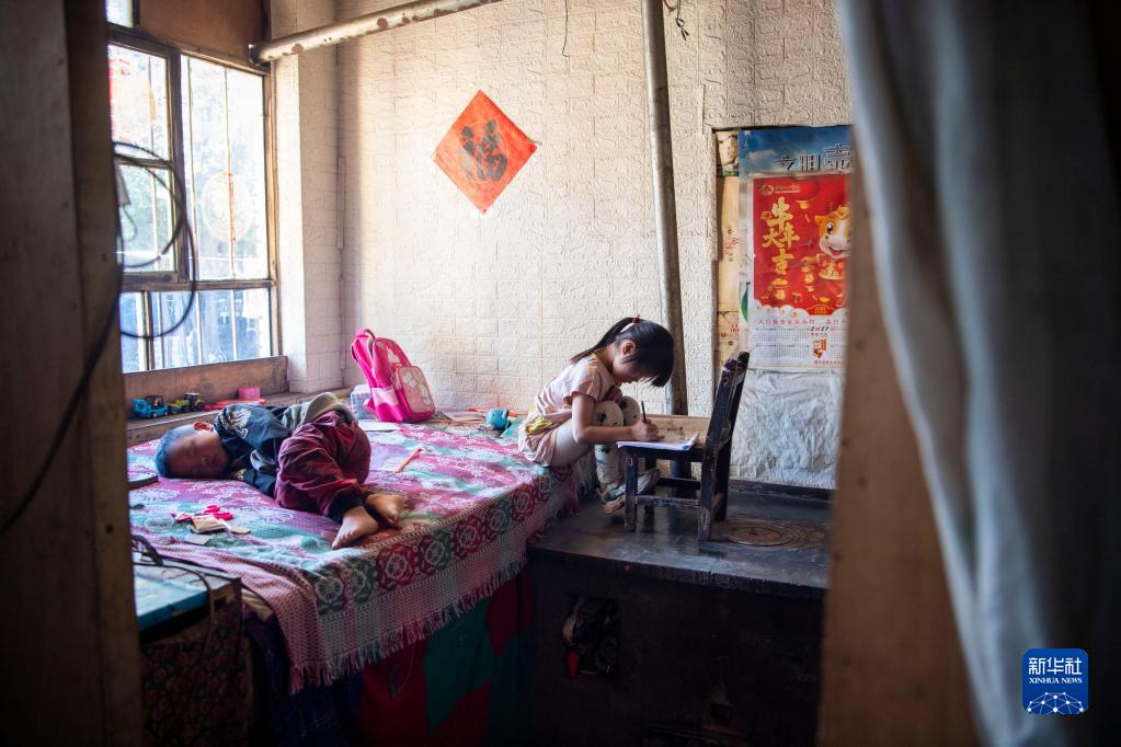 学校放假期间,景鹏佳(右)在位于山西省壶关县大峡谷镇壶陵水村的家里写作业,弟弟景义可在床上睡觉(5月30日摄)。