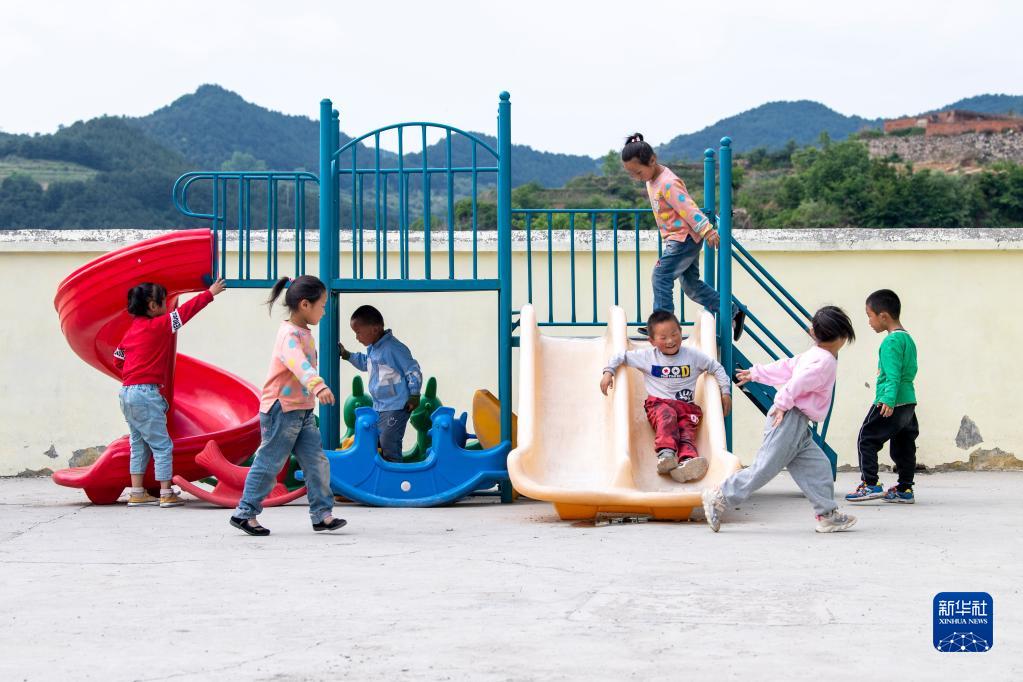 在鹅屋中心学校天鹅湖幼儿园,景义可(前排右三)和同学们玩滑梯(5月24日摄)。