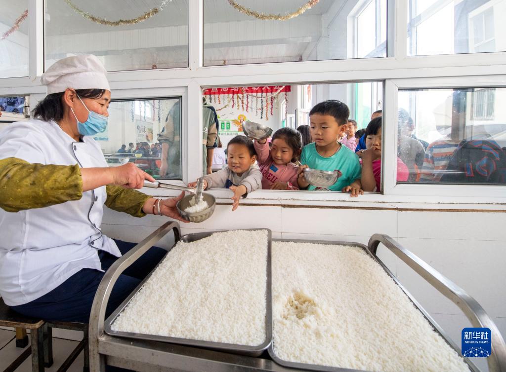 在鹅屋中心学校鹅屋寄宿制小学,景义可(左二)和同学们在餐厅排队打饭(5月24日摄)。