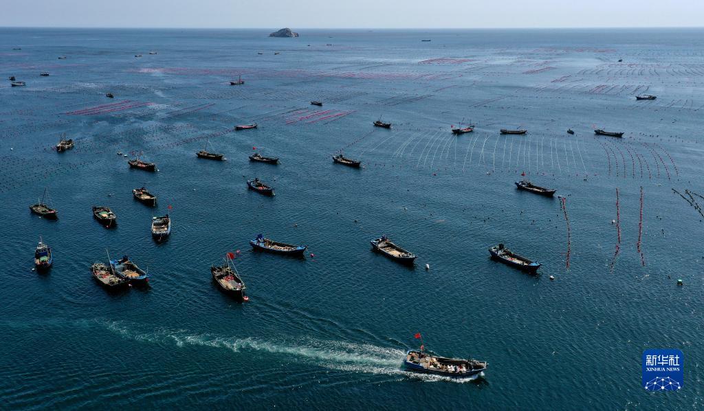 5月31日,长海县海洋岛镇的渔民驾驶渔船在海洋牧场上作业(无人机照片)。 新华社记者 姚剑锋 摄