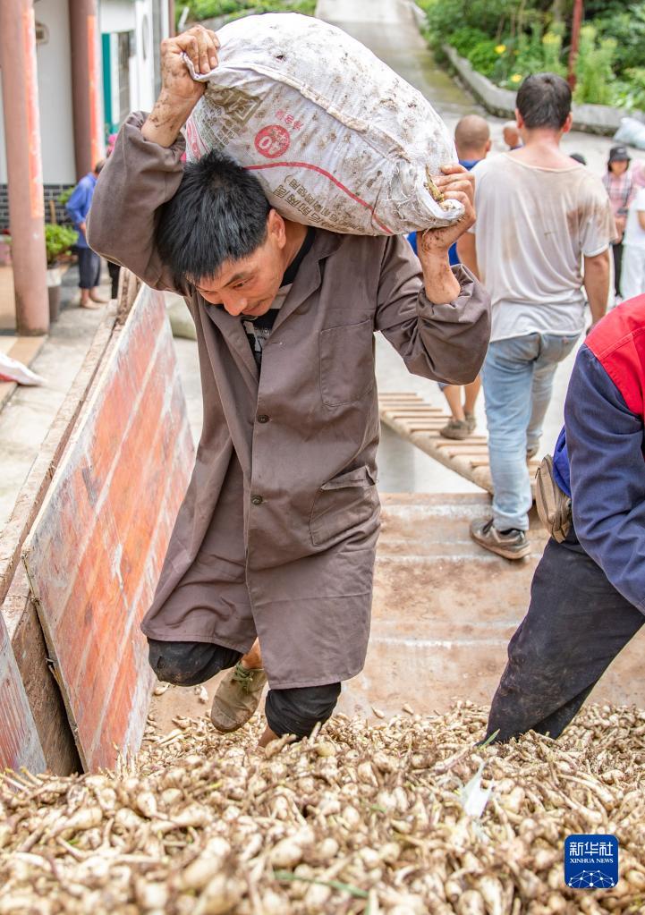 5月30日,在重庆市丰都县高家镇建国村,村民将出售的新鲜藠头搬运上车。