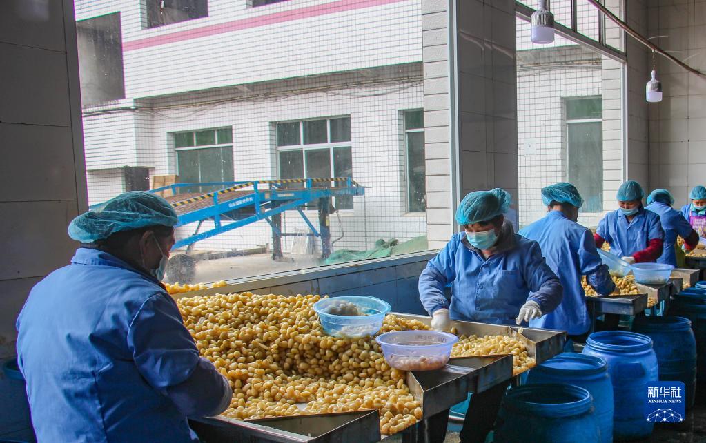 3月23日,在重庆丰都明富实业有限公司,工作人员为腌制后的藠头剥皮。