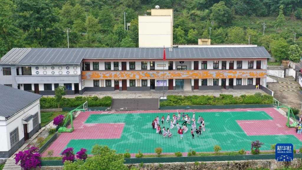 6月1日,化屋小学学生在操场上跳芦笙舞,欢度“六一”国际儿童节(无人机照片)。