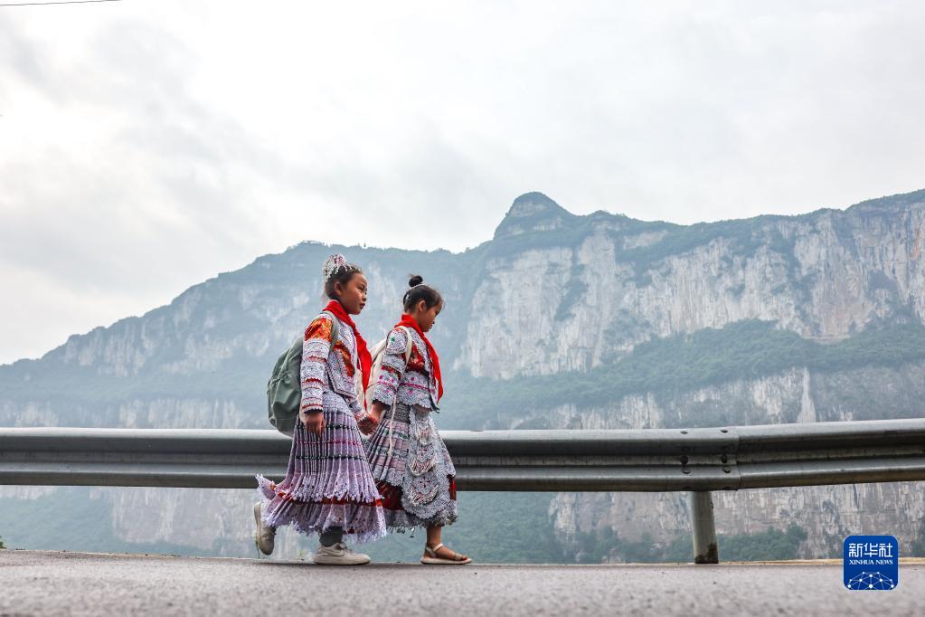 6月1日,杨雅萌(右)与同学杨国语一同走在上学路上。