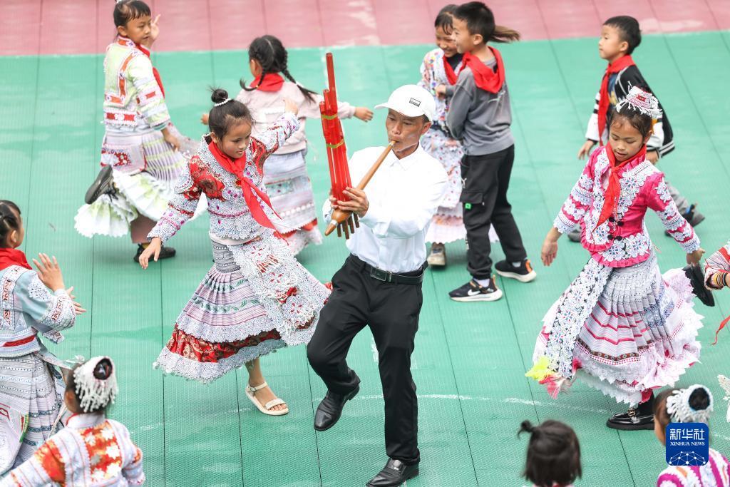 6月1日,杨雅萌(中间左)在学校内与同学们一起跳芦笙舞。