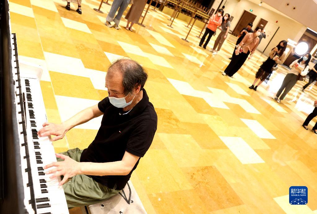 6月1日,74岁的上海市民黄为民在上海兴业太古汇商场弹奏钢琴。 新华社记者 陈飞 摄