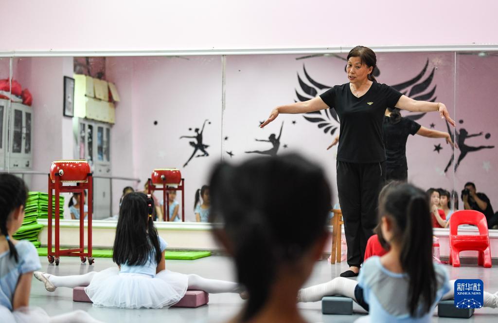 在四川省中江县留守儿童艺术团,刘春香(后)在教孩子们学习舞蹈(5月29日摄)。