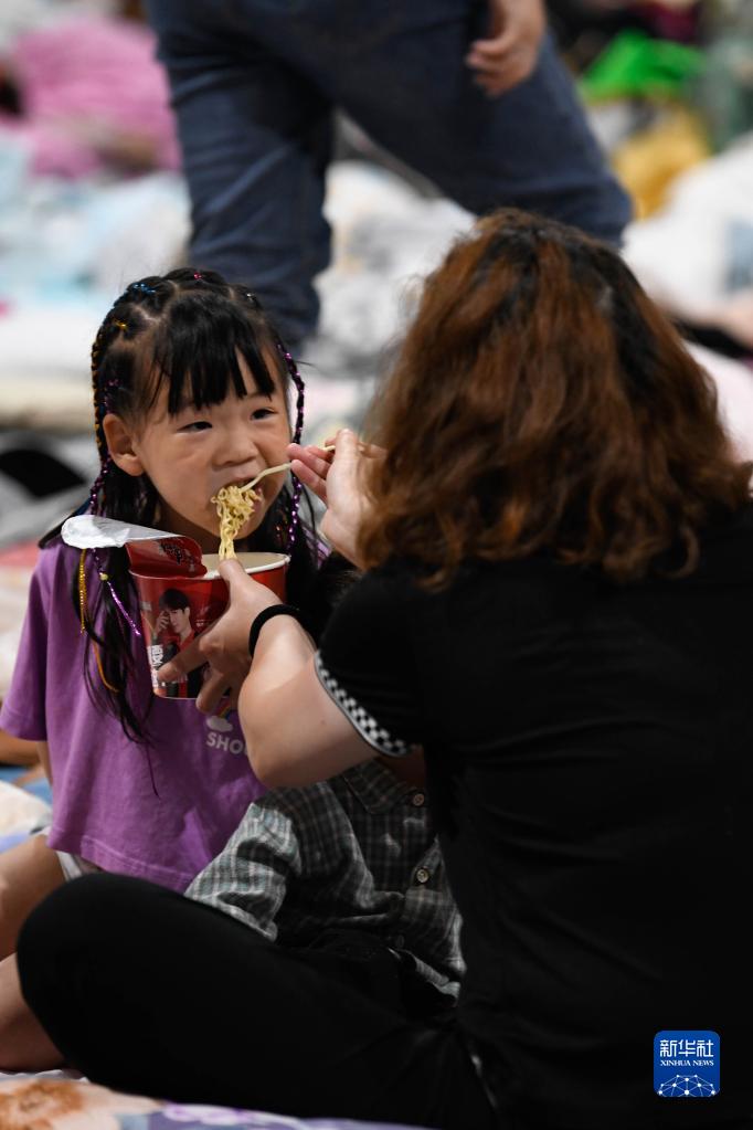 6月2日凌晨,群众在四川雅安市宝兴县体育馆安置点内吃面。新华社记者 胥冰洁 摄