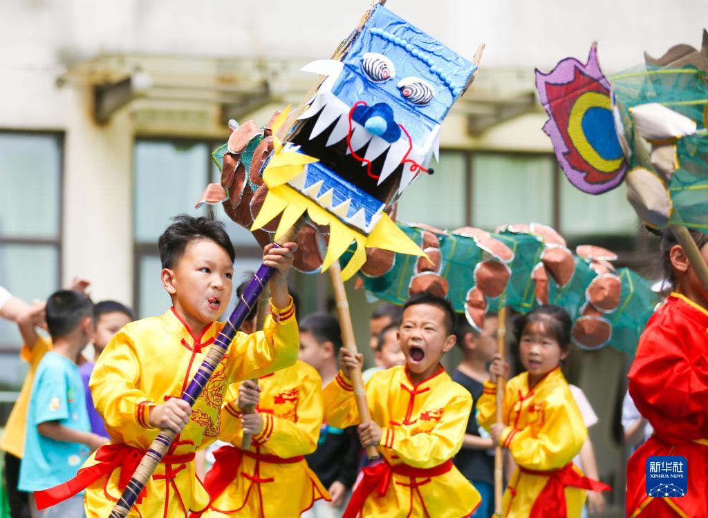 5月31日,浙江省湖州市德清县洛舍镇中心幼儿园的孩子们表演舞龙。