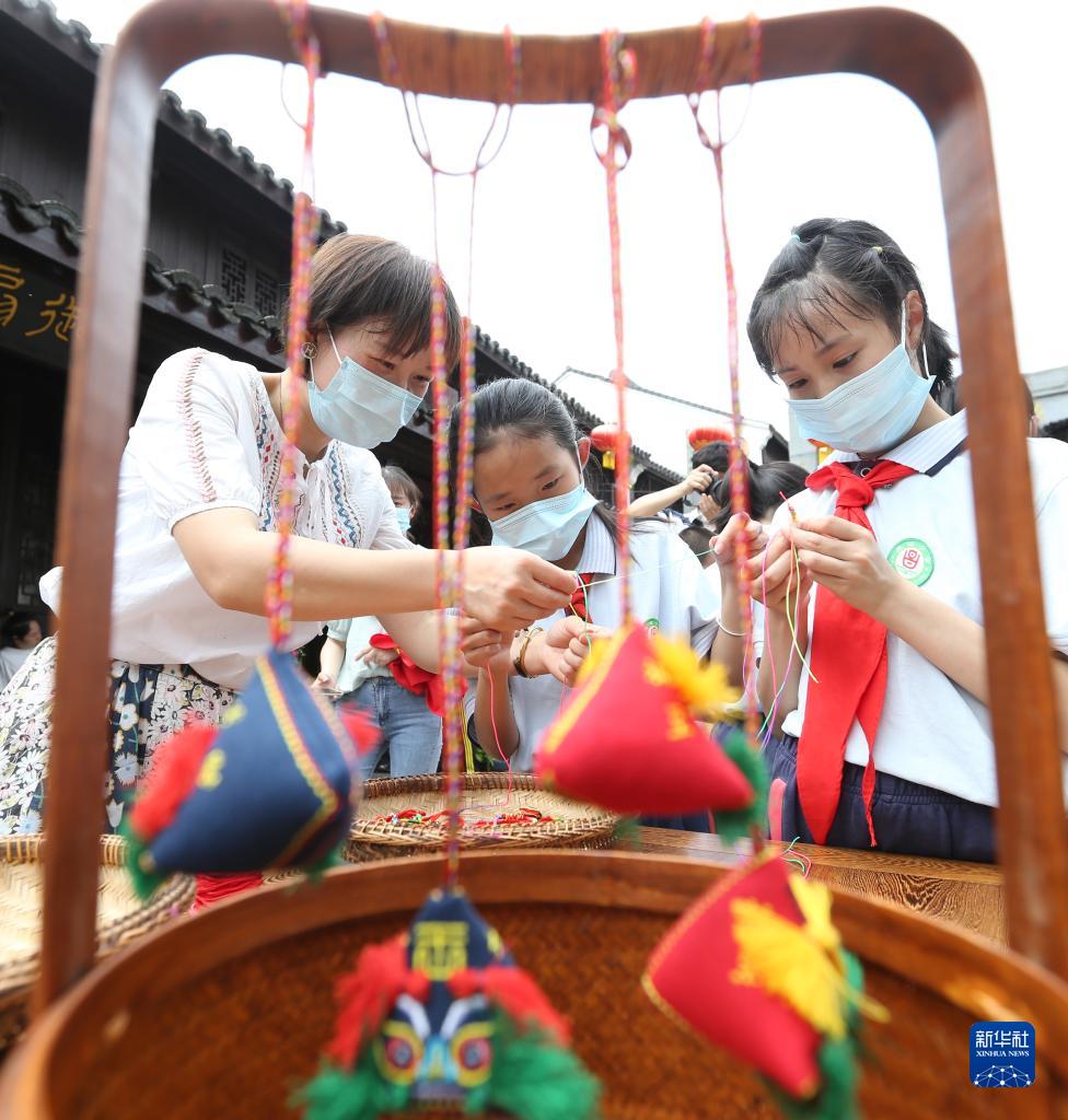 5月30日,在浙江省湖州市安吉县鄣吴镇,学生在老师的指导下制作香囊。