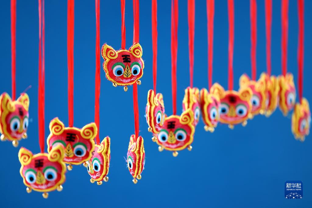 5月29日,山东省枣庄市龙山路街道居民在家中阳台上悬挂香囊。