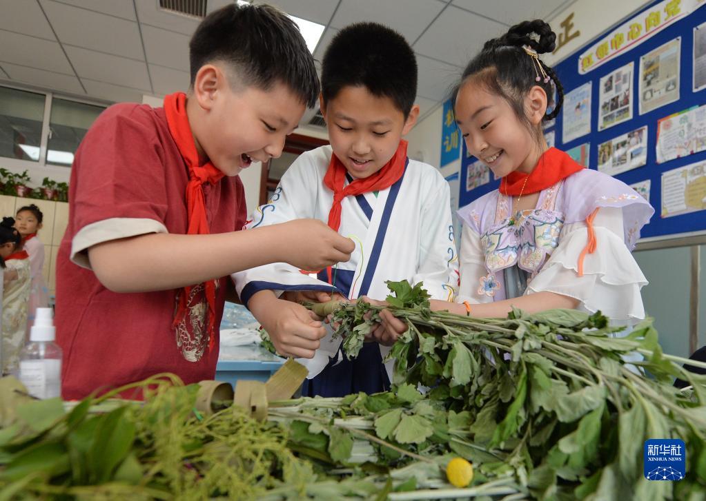 5月31日,在山东省青岛市桦川路小学开展的“多彩民俗迎端午”主题活动上,三名学生在捆扎艾草。