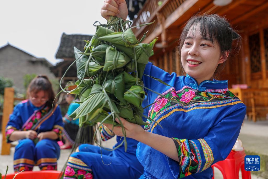 5月31日,贵州省铜仁市玉屏侗族自治县新店镇新店村的村民展示自己包的粽子。