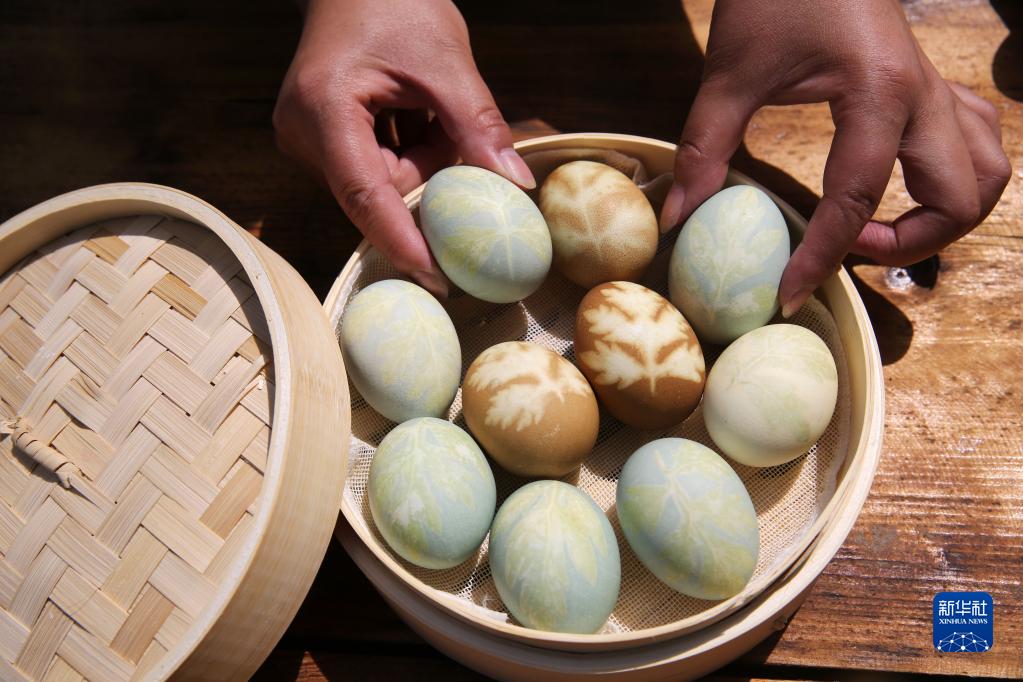 5月28日,在江苏省连云港市连云区连岛街道,人们展示制作好的艾叶蛋。