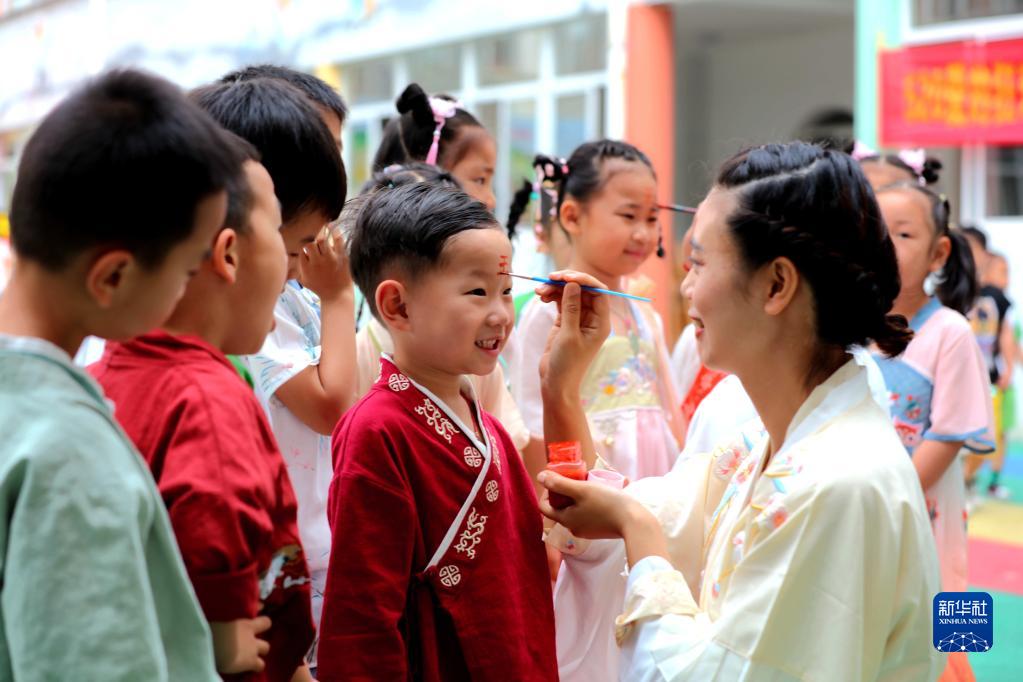 6月1日,浙江省湖州市长兴县洪桥镇中心幼儿园老师用雄黄在孩子额头上画“王”字。