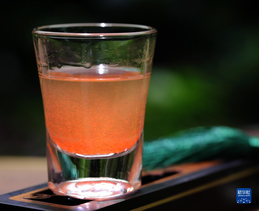 5月29日,在浙江省诸暨市同山镇丽坞底村,村民用自家酿的同山高粱烧酒调配出雄黄酒。