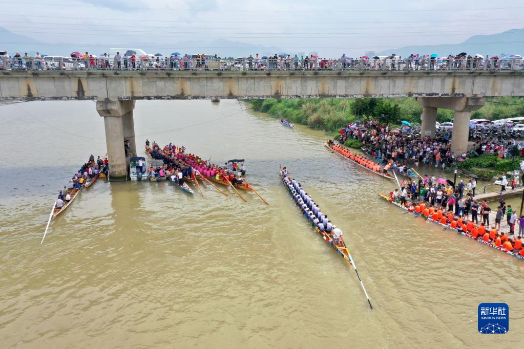 6月1日,在福建省福州市闽侯县南通镇方庄村附近的大樟溪河面上,附近村民在进行迎端午龙舟竞渡活动(无人机照片)。