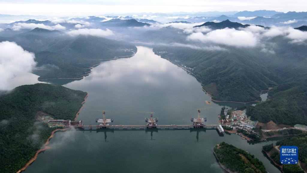 正在进行主塔封顶施工的池黄铁路太平湖特大桥(6月2日摄,无人机照片)。