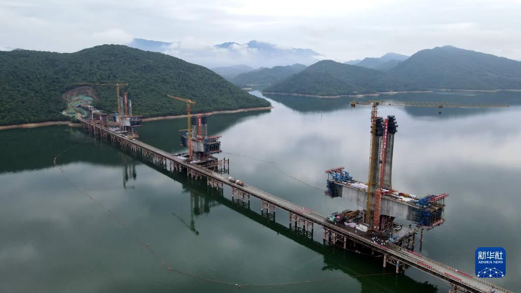 正在进行主塔封顶施工的池黄铁路太平湖特大桥(6月2日摄,无人机照片)。