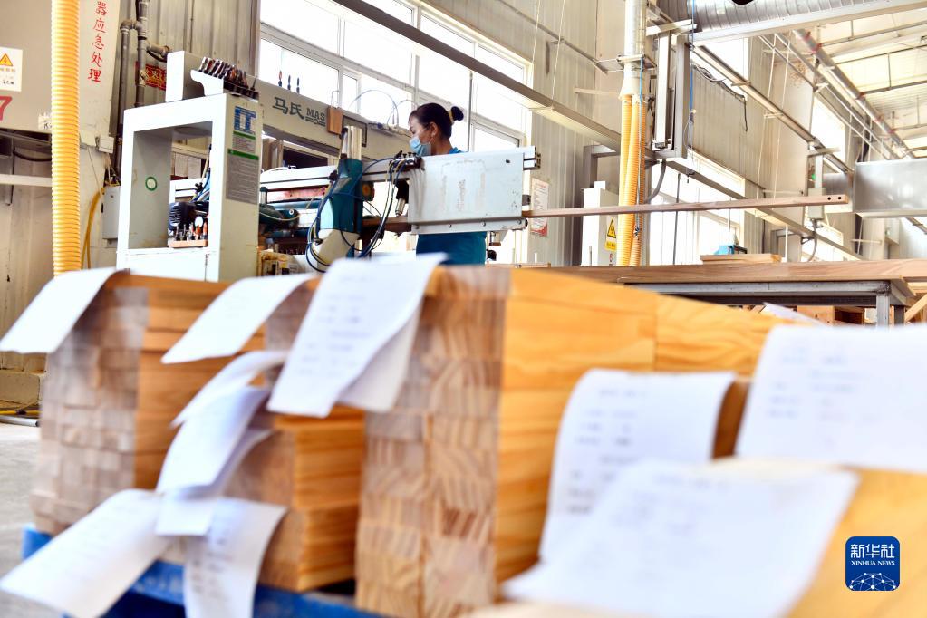 6月1日,山东华日家具有限公司的工作人员在加工订单家具。
