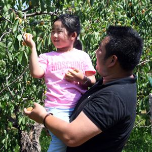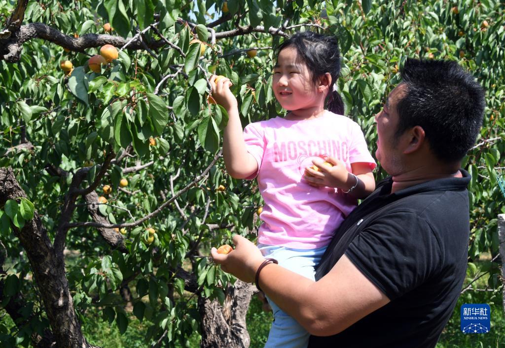 6月2日,在北京市平谷区南独乐河镇北寨村的一处果园,一名小朋友采摘北寨红杏。