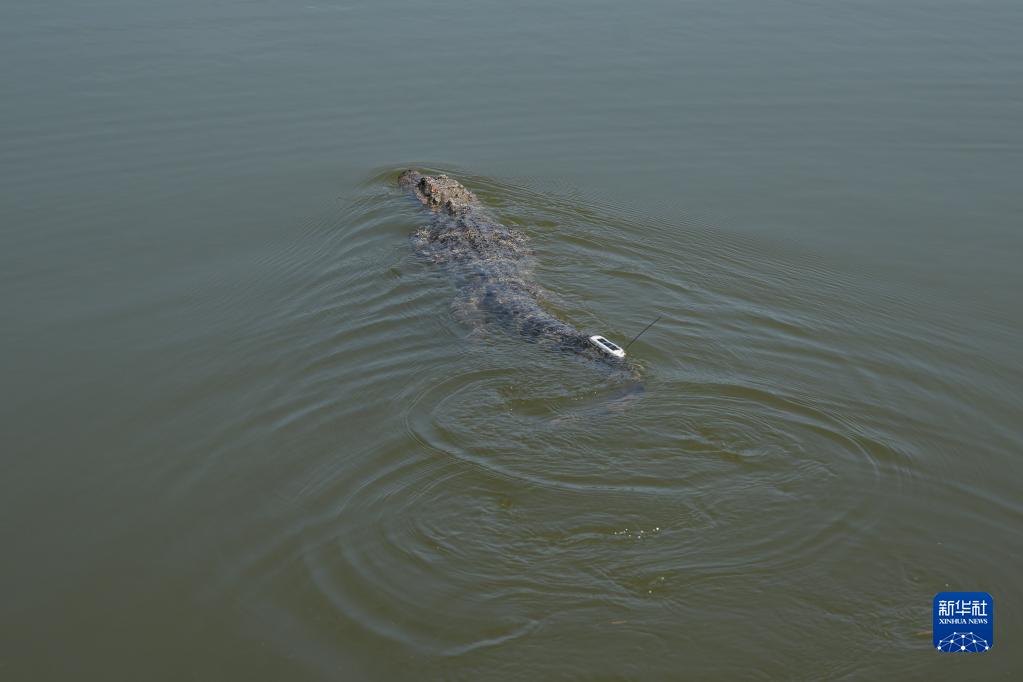 6月2日,在安徽扬子鳄国家级自然保护区郎溪县高井庙片区,一条被放归的扬子鳄在池塘中游弋。
