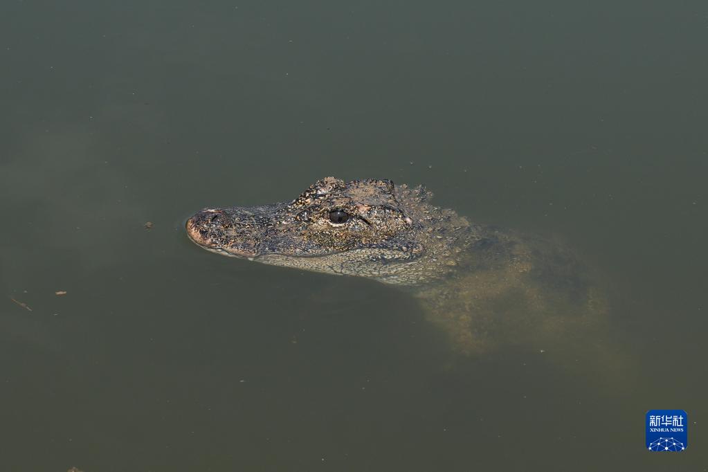 6月2日,在安徽扬子鳄国家级自然保护区郎溪县高井庙片区,被放归的扬子鳄在池塘中。
