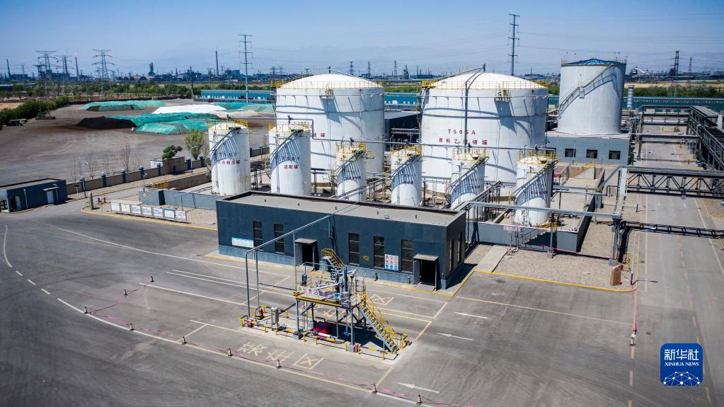 这是6月1日拍摄的位于宁夏石嘴山市的宁夏首朗吉元新能源科技有限公司的燃料乙醇成品罐区(无人机照片)。