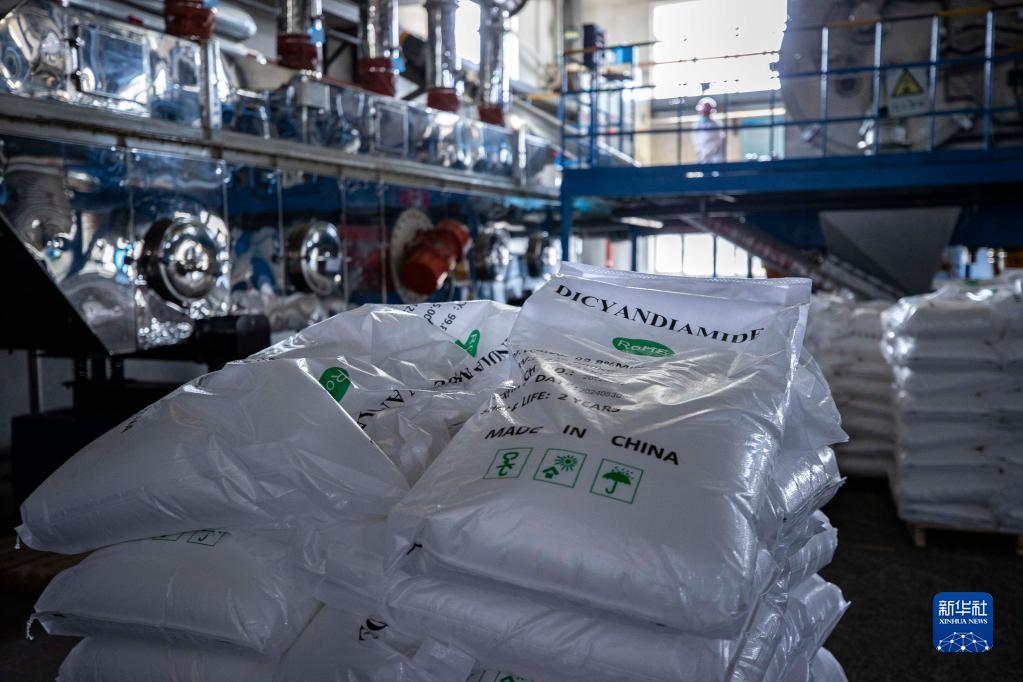 这是位于宁夏石嘴山市的宁夏贝利特生物科技有限公司产品车间内即将出口的电子级双氰胺(5月31日摄)。