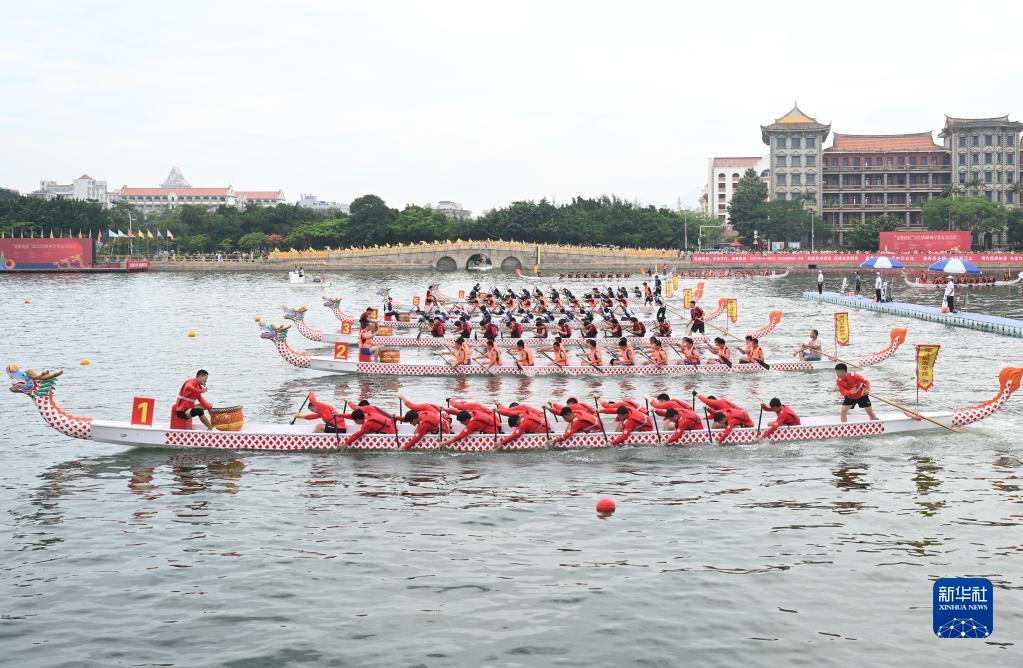 当日,“龙腾虎跃”2022海峡两岸赛龙舟活动在福建厦门举行,两岸41支参赛队的千余名选手乘风逐浪、奋勇争先。