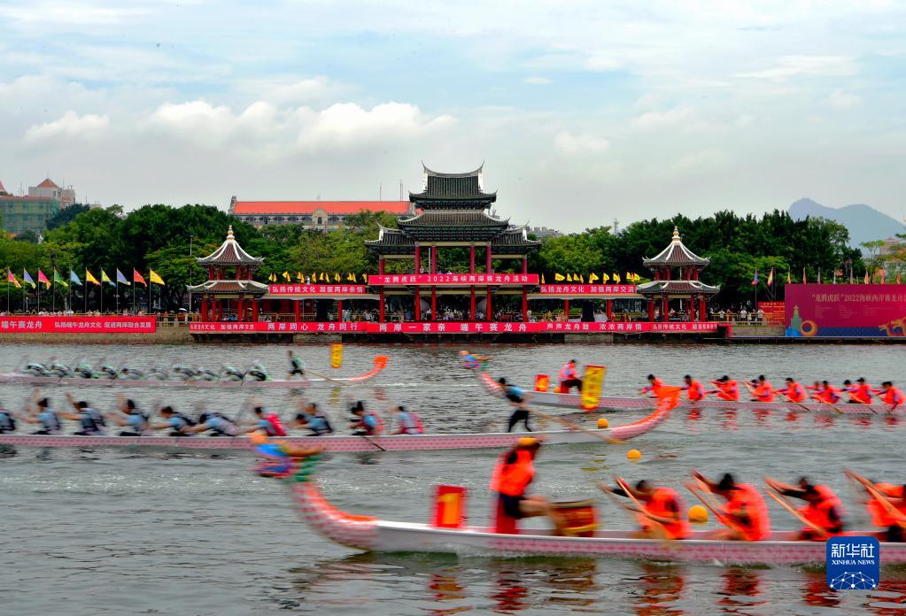 当日,“龙腾虎跃”2022海峡两岸赛龙舟活动在福建厦门举行,两岸41支参赛队的千余名选手乘风逐浪、奋勇争先。