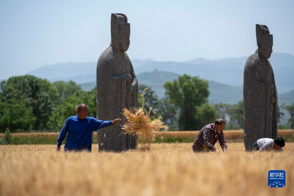 近日,位于河南省巩义市的宋陵区域迎来麦收季。宋陵总面积约189平方公里,一些石像生矗立田间。在永泰陵内,为了避免对石像生造成破坏,在北宋皇陵管理处人员的监管下,工作人员驾驶收割机在外围收割,而对于石像生周边的小麦则采用人工镰刀收割的形式。一时间,“人机结合”,跨越古今,千年石像生见证中原大地又一次丰收。