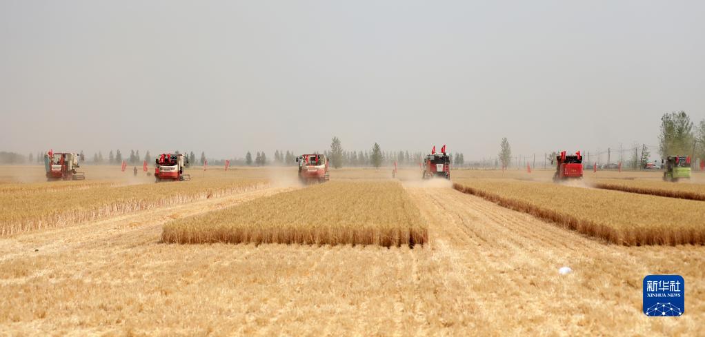 6月2日,在山东省临沂市郯城县郯城街道,参加小麦机收减损技能大比武的农机手驾驶收割机收割小麦。新华社发(张春雷摄)