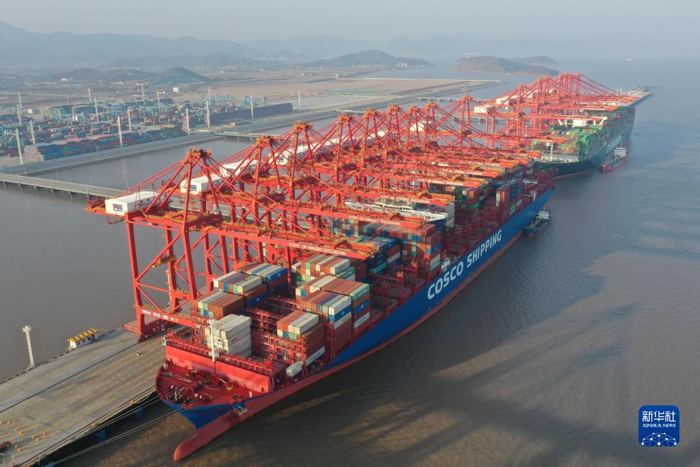 货轮停靠在浙江宁波舟山港梅东码头(2021年2月19日摄,无人机照片)。新华社记者 黄宗治 摄