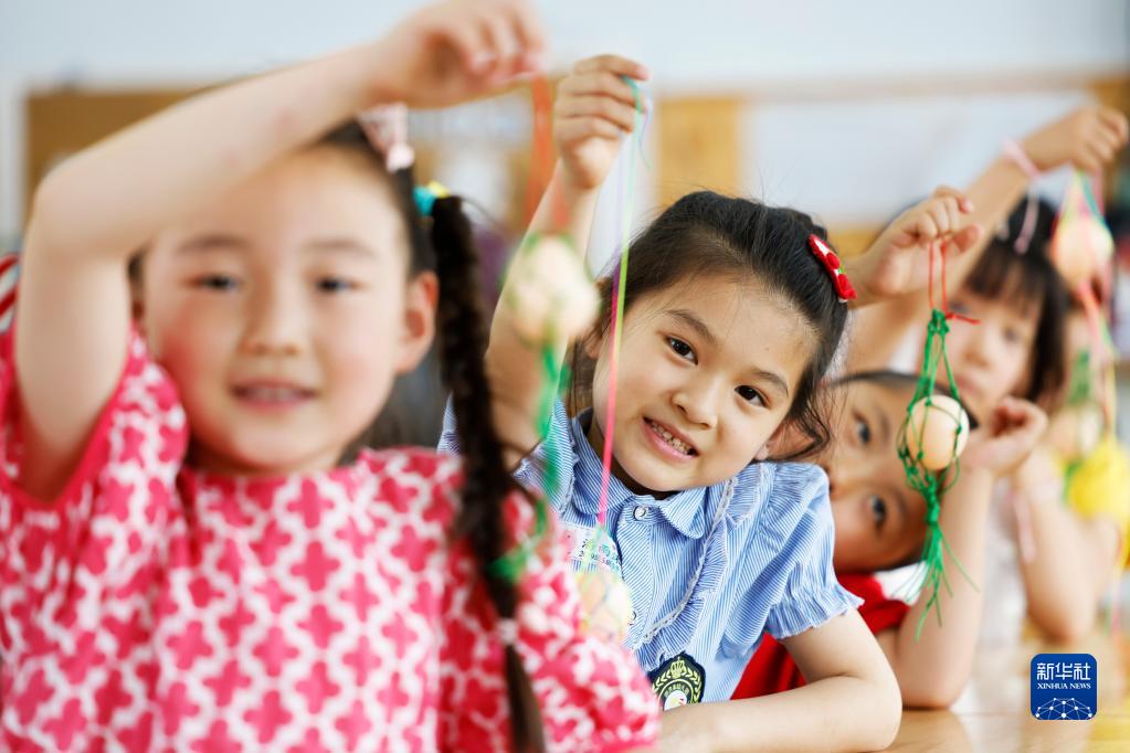 6月2日,在江苏省宿迁市泗洪实验幼儿园,小朋友们展示自己制作的鸡蛋网。