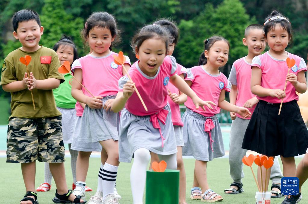 6月2日,四川省南充市蓬安县城东幼儿园的孩子们在玩“投壶”游戏。
