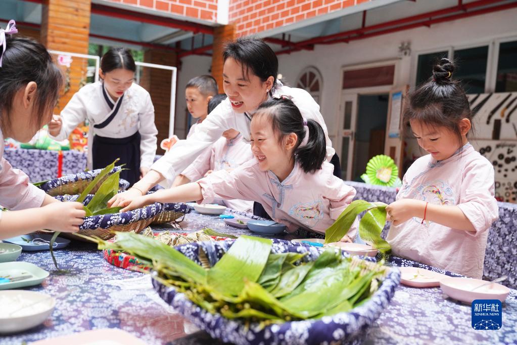 6月2日,在重庆市北碚区实验幼儿园,老师带着孩子们体验包粽子。