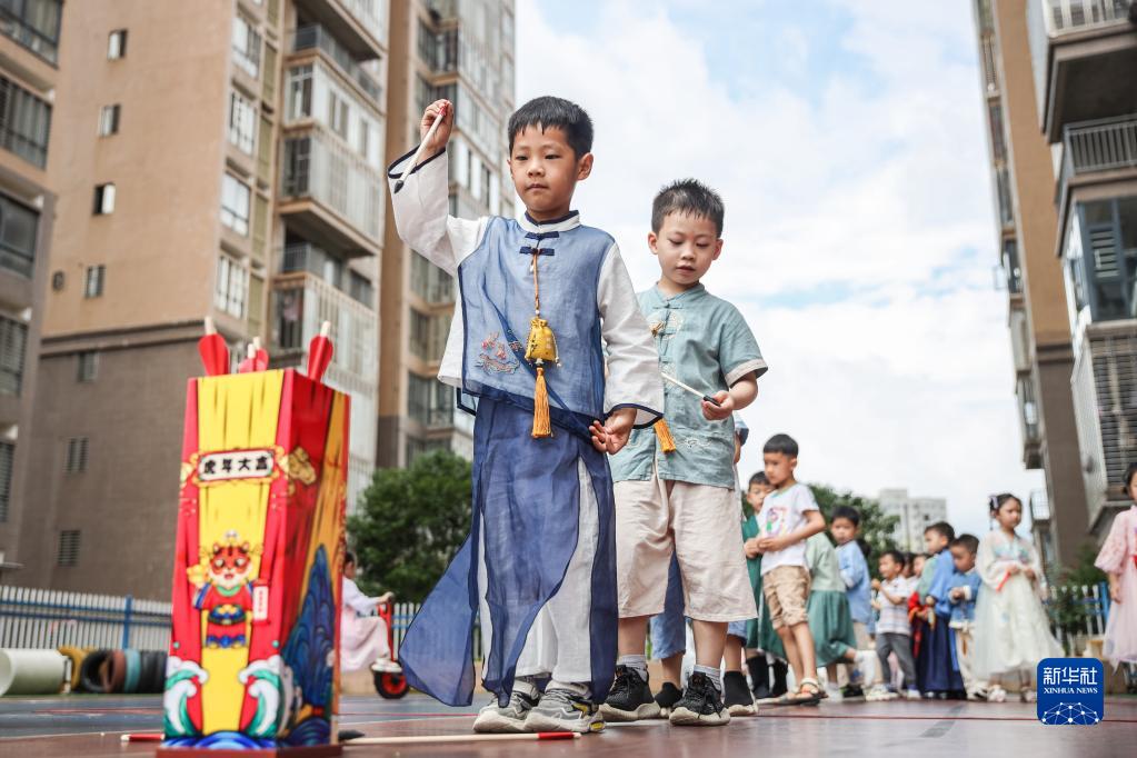 6月2日,湖南省永州市蓝山县一家幼儿园的小朋友们在体验“投壶”。