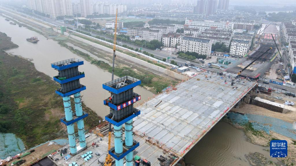 施工人员在中铁四局引江济淮工程江淮沟通段青龙桥项目现场作业(6月3日摄,无人机照片)。