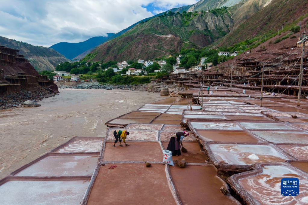 加达村村民在古盐田里劳作(无人机照片,5月26日摄)。