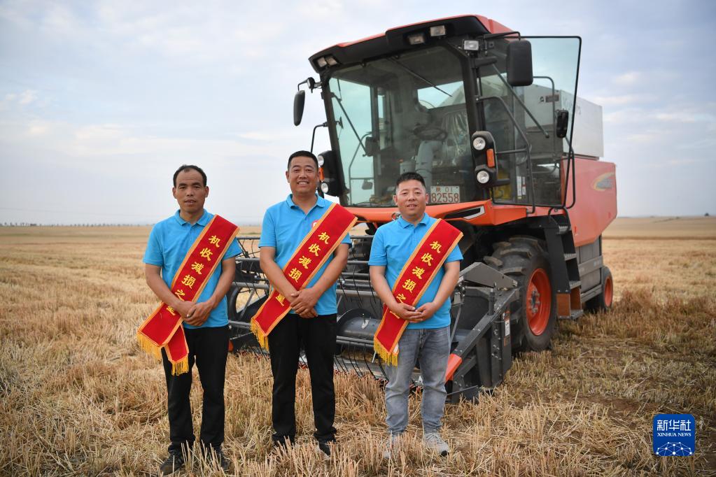 6月2日,在西安市长安区王曲街道神禾塬的麦田里,西安市小麦机收减损大比武活动一等奖获得者朱振学(中)、二等奖获得者张文武(右)和杨延勉合影留念。
