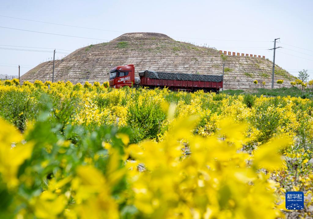货车行驶在宁夏石嘴山市石炭井大磴沟生态修复示范区(5月31日摄)。